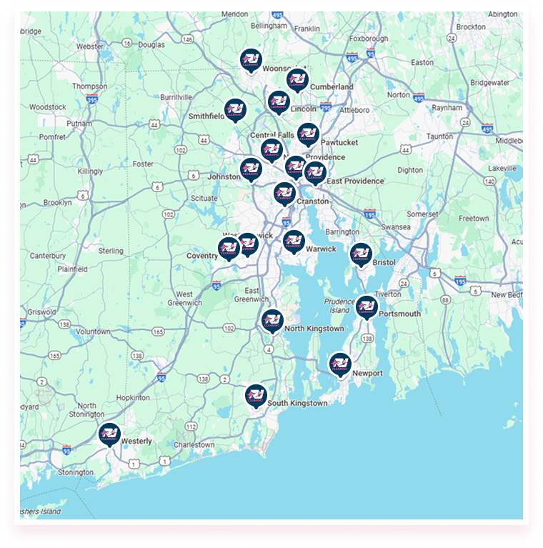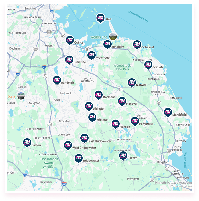 We proudly serve a wide area in South Shore, MA, Cape Cod, MA, and the state of Rhode Island. Not all locations are listed below. If you don't find your location, please call our office to verify.